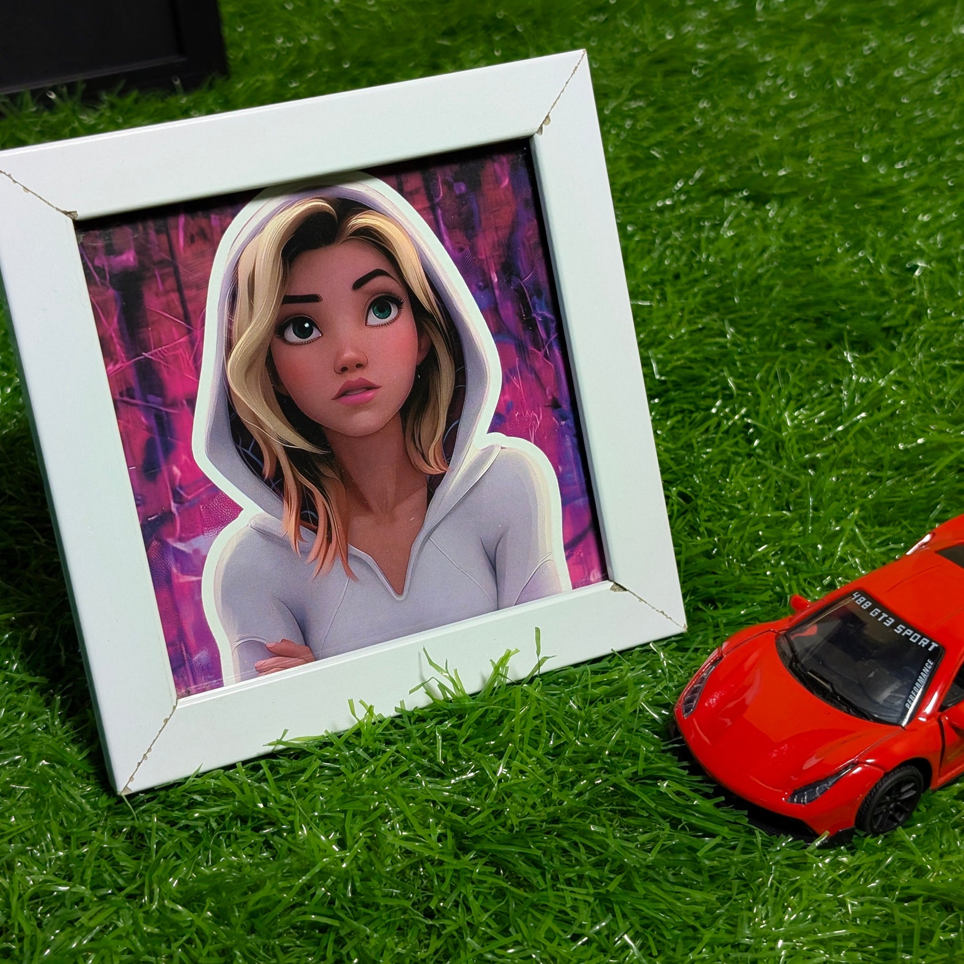 Add a touch of Spider-Verse style to your space with this Gwen Stacy (Ghost-Spider) Collectible Mini Frame, inspired by the iconic Marvel comics and animated films. The artwork features Gwen Stacy in her signature white hoodie, a powerful and stylish representation of confidence, independence, and modern superhero culture.